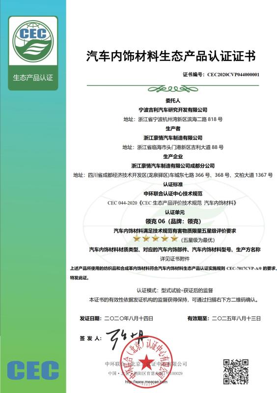 2020年8月14日,中環(huán)聯(lián)合向?qū)幉囇芯块_發(fā)有限公司簽發(fā)了首張“汽車內(nèi)飾材料生態(tài)產(chǎn)品認(rèn)證證書”,吉利生產(chǎn)的“領(lǐng)克06”車型所使用的紡織品和合成革類內(nèi)飾材料經(jīng)評(píng)價(jià)滿足技術(shù)規(guī)范有害物質(zhì)限量五星級(jí)的要求。