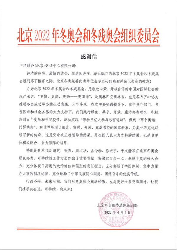 中環聯合(北京)認證中心有限公司(以下簡稱中環聯合),由于為北京2022年冬奧會和冬殘奧會在綠色辦奧、可持續性工作方面作出了重要貢獻,近日也收到了來自北京冬奧組委總體策劃部的感謝信。