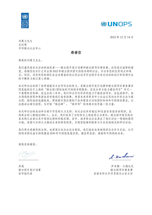 近日,聯合國開發計劃署和聯合國項目事務署向中環聯合認證中心發來感謝信,對中環聯合認證中心代表在2022年聯合國中國可持續采購研討會的精彩分享表示感謝,并希望以此為契機,繼續深化合作交流,共同推進2030年可持續發展議程,建設更包容、 強韌和可持續的未來。