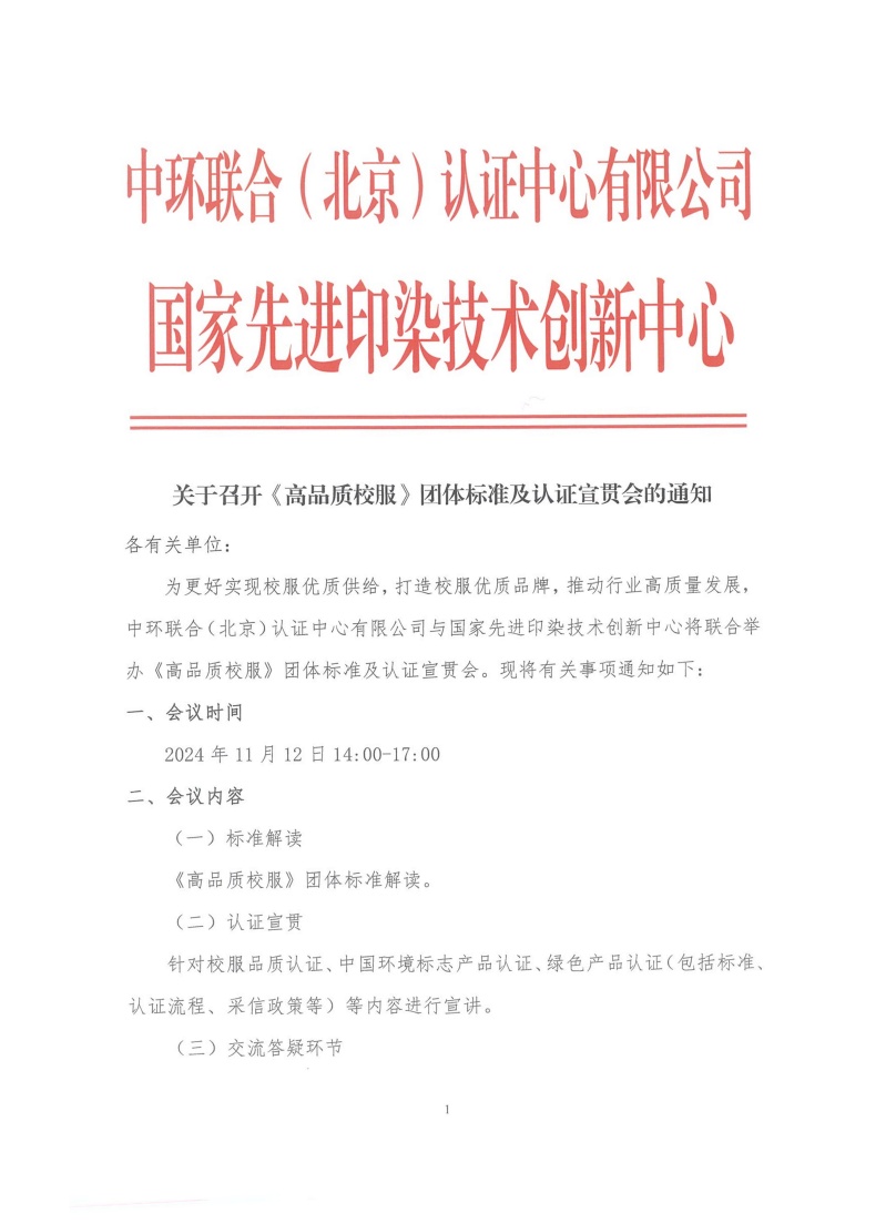 關(guān)于召開《高品質(zhì)校服》團體標準及認證宣貫會的通知